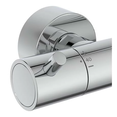 Minimalistic cylindrical design with 2 in 1 pin easy-grip handle and override button. Includes Ideal standard FirmaFlow Therm cartridge for precise temperature control, with adjustable temperature limitstop.