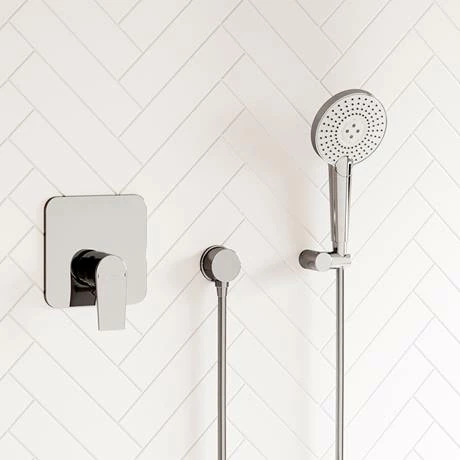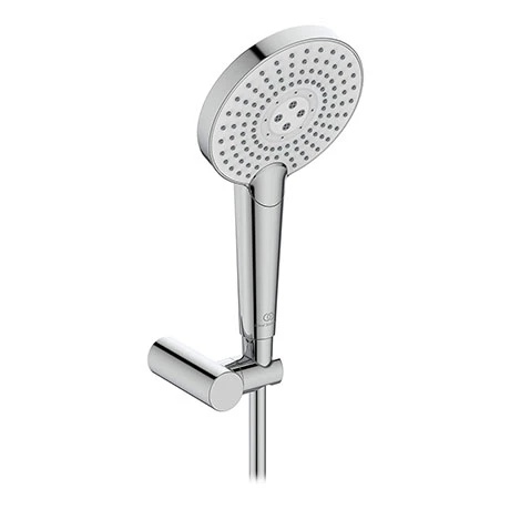 This Idealrain Evo shower kit consists of a 3 function round shaped 125mm handspray featuring 3 shower modes all selectable via a single push button, wall bracket for handspray and 1.75m IdealFlex hose. Suitable for high-pressure installations.