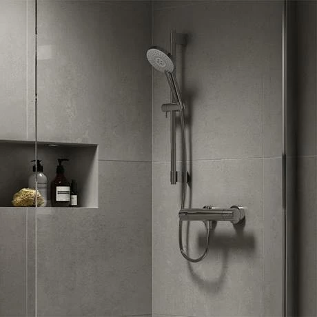 This Idealrain Evo Jet shower kit includes a 3 function diamond Ø125mm handspray, featuring 3 shower modes (including an invigorating Drop Jet) all selectable via a single push button, 600mm slide rail and 1.75m IdealFlex hose. Suitable for high pressure installations.