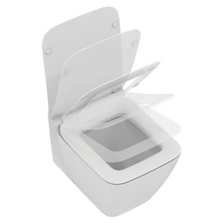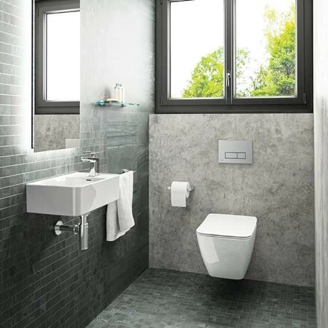 This Ideal Standard Strada II AquaBlade toilet bundle consists of a wall hung pan, soft close seat, wall hung WC frame with cistern and chrome flush plate. The Strada II wall hung toilet features Ideal Standard’s AquaBlade® technology delivering a quieter, cleaner and smarter flush every time. The narrow channel reduces turbulence, making for a much quieter flush while the design of the bowl makes it easy to clean and leaves 95% of the bowl surface clean every time, compared with traditional WCs which leave 20% of the bowl unwashed. The toilet seat has a gentle and quiet soft-closing mechanism to add a little more comfort while the WC cistern features a 6/4 litre or 4.5/3 litre dual flush.Â